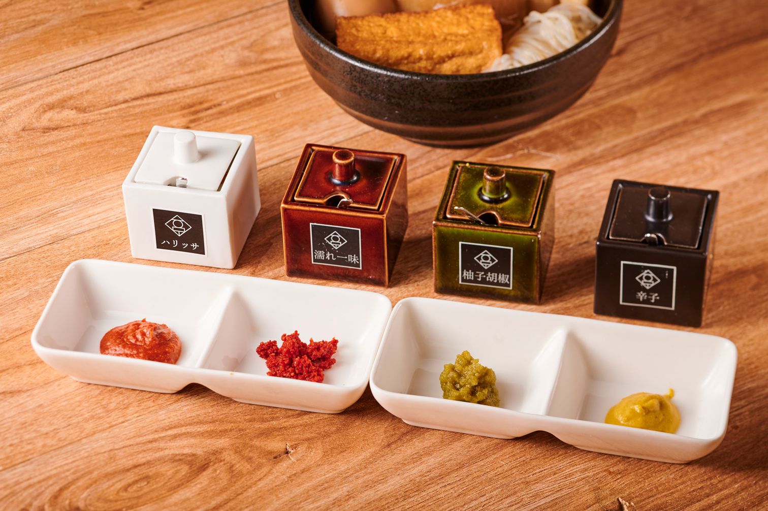 昔ながらの「おでん」の提灯が目印。暖簾をくぐった先にあるのは、大衆酒場を思わせる居心地の良い空間。木の温かみを感じられるコの字型カウンターで、こだわりのおでんをご堪能ください。醤油ではなく鰹出汁を使用した、365日いつでも美味しく食べられるおでんです。大根やはんぺんなどの定番はもちろん、コロッケやガーリックトーストなどの変わり種もご用意しています。ねぎ醤油や柚子胡椒など、豊富な薬味と一緒にお楽しみください。