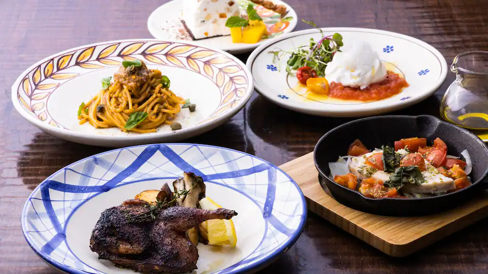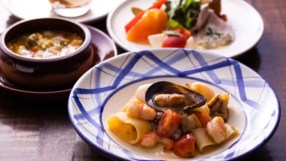 Enjoy casual Italian dishes serving directly from show kitchen, featuring home-style Italian dishes, pasta, pizza from stone oven.