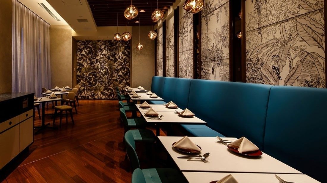 チャイナブルーの色鮮やかソファー、天井が高く広々とした空間を感じる店内で、食事を楽しめます。優雅な時間を過ごすディナーも、気軽なランチにもご利用いただけます。本格中華はもちろんのこと、シンガポールではメジャーな「ポピア」などの、アジアの料理もご用意しています。