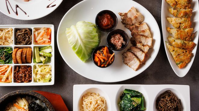 隠れ家のような店内に一歩足を踏み入れると、洗練された大人な雰囲気が広がります。そんな店内で楽しめるのは、宮廷料理のような華やかな韓国料理の数々です。蒸したブランド豚をキャベツで包んで食べる岩中豚のポッサムや、鶏肉丸々一羽を使った参鶏湯など、いずれも美味しさはもちろん、食べた人に「美しく健康でいてほしい」という思いが込められています。有田焼しか使わない、お皿にまでこだわった当店で、とびきりのひとときをお過ごしください。