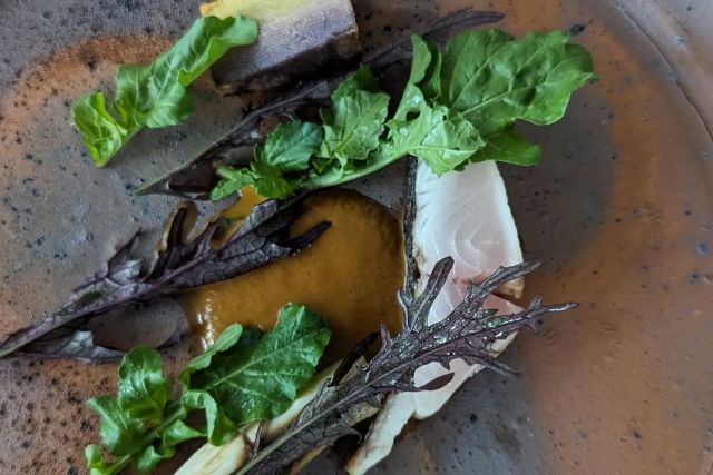 Dinner Course with Non-Alcoholic Pairing Dinner course with a non-alcoholic drink course, featuring seasonal ingredients, teas, and juices made by fermenting ingredients, served with the course meal.