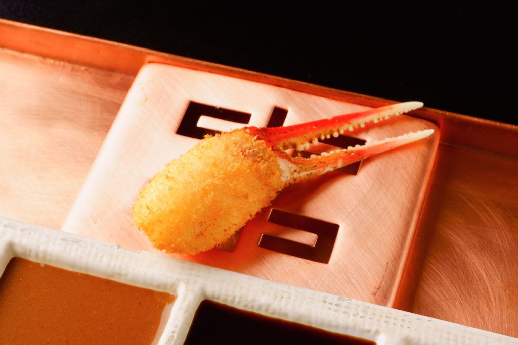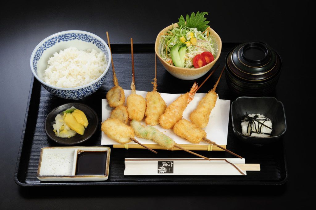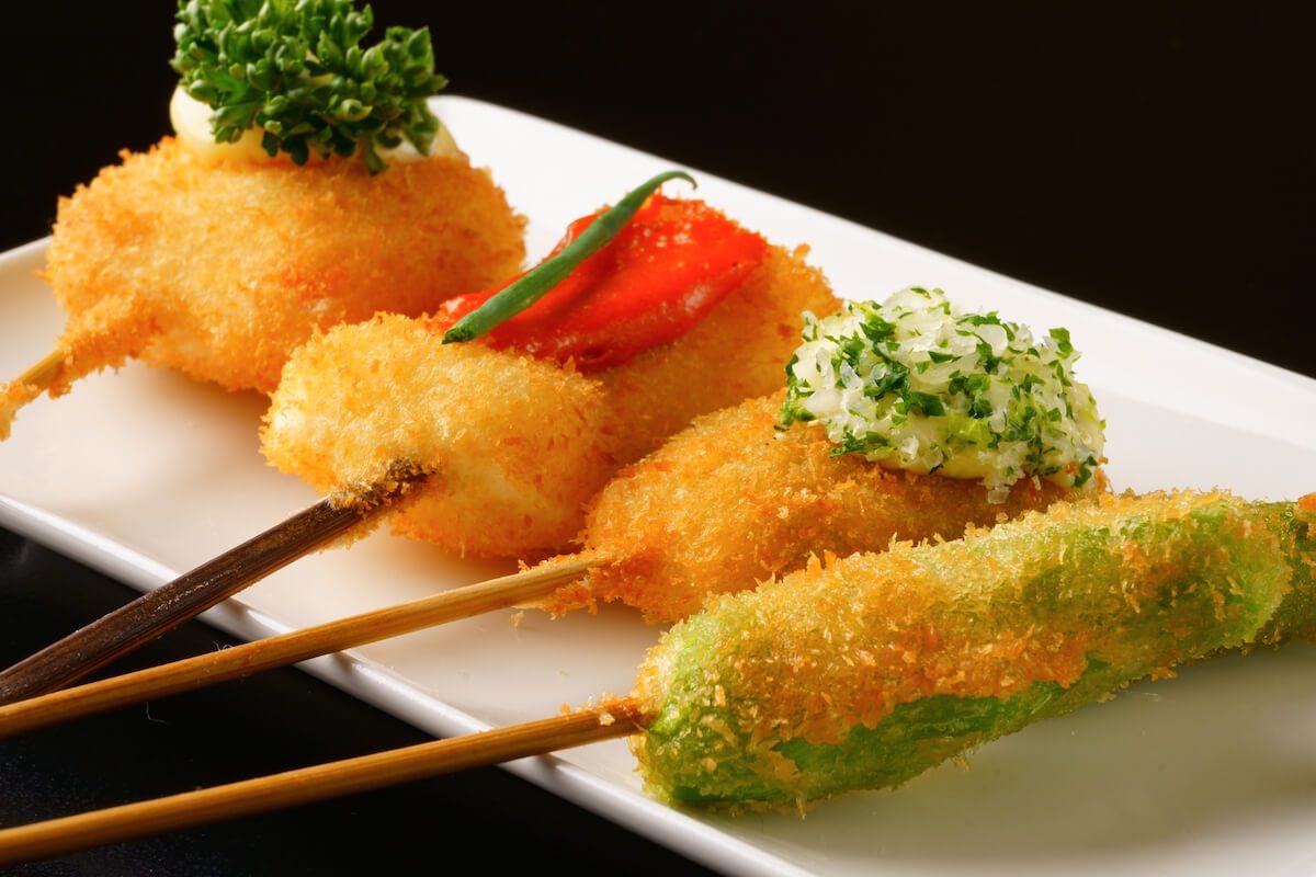 Set contents: 18 skewers (Wagyu beef, crab claws, chicken wings, seasonal seafood, seasonal vegetables, etc.) plus cabbage and vegetable sticks - 8,800 yen per person (tax included)