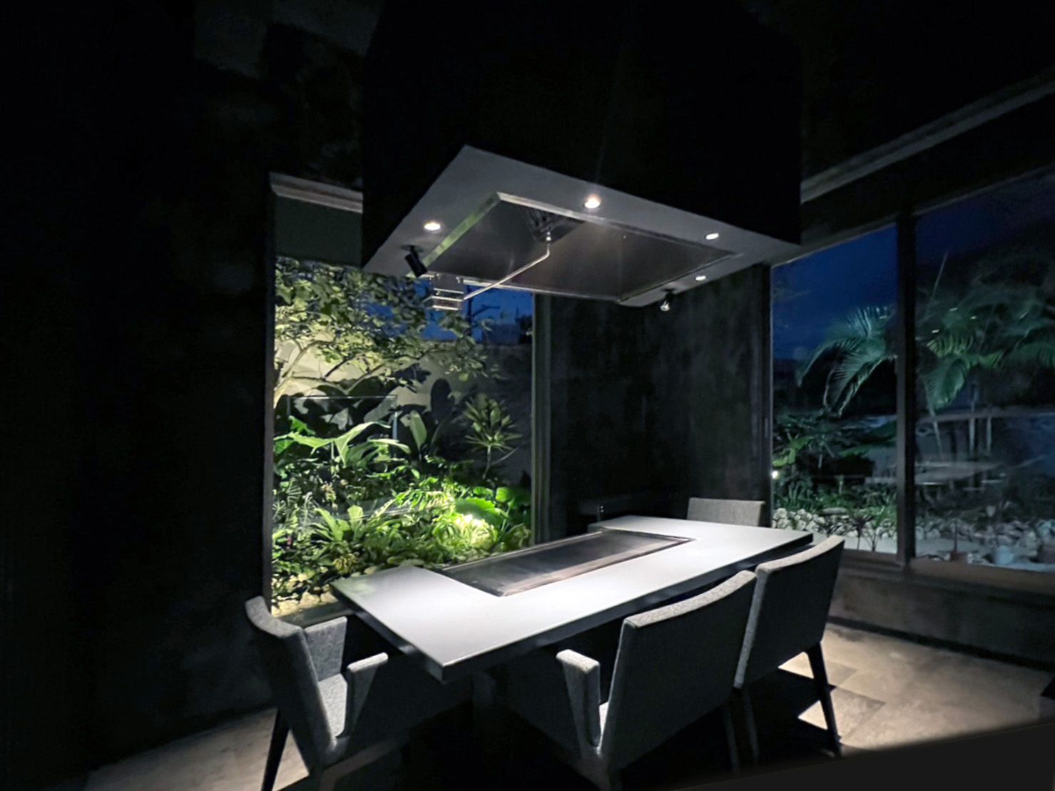 店内はシンプルで落ち着いた空間です。1日2組限定の完全予約制なので、ゆったりとした時間を過ごせます。ヤンバルの森をイメージした庭を眺めながら、シェフが目の前でおもてなし。沖縄・九州で厳選された特選黒毛和牛を中心に、こだわりの食材を絶妙な焼き具合で調理してお出しします。食事の時間を楽しんでもらうために、シャンパンや泡盛、日本酒などもご用意。特にワインの数は豊富で、フランス・ブルゴーニュからナパバレーまでさまざまな種類を幅広く取り揃えています。