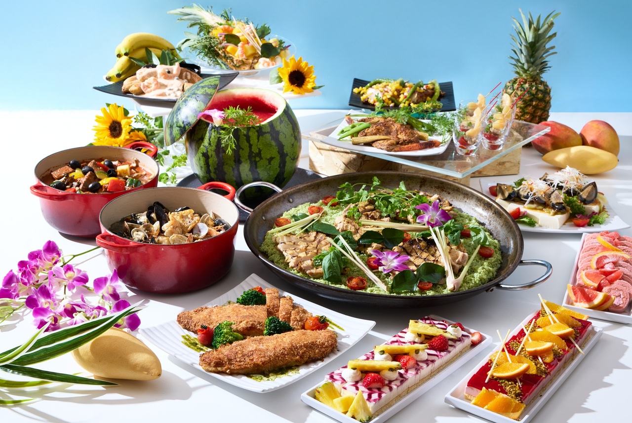 フリーフロー付!ボイル蟹や、彩り豊な前菜やサラダ、魚料理、お肉料理など70種類以上の多彩な食材がビュッフェボード並ぶ、オールデイダイニング&ラウンジ ザ・ループのビュッフェ。