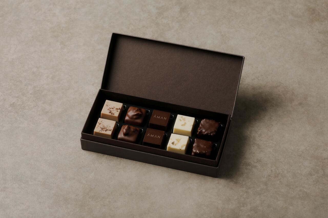 It comes in a pack of two, with another piece containing a milk chocolate with the Aman logo.