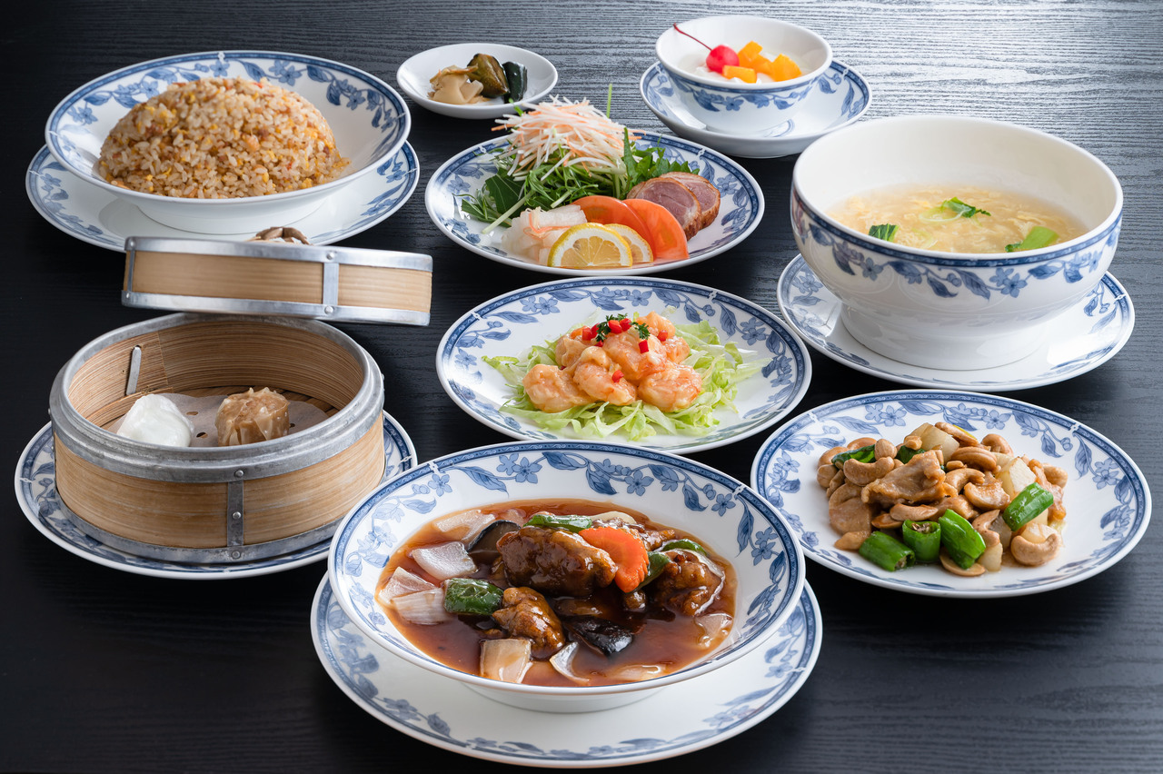 二種盛りサラダ付き前菜、本日のスープ、点心三種盛り合わせ、海老のチリソース、酢豚、薬味を添えた中華がゆまたは五目焼き飯 、杏仁豆腐と中華菓子