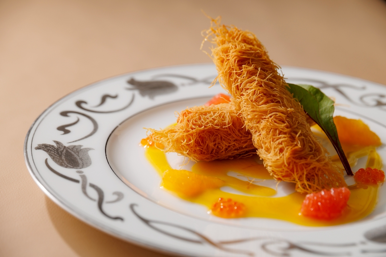 Cherry trout wrapped in kataifi crisp, with citrus-scented beurre blanc sauce and trout roe pearls