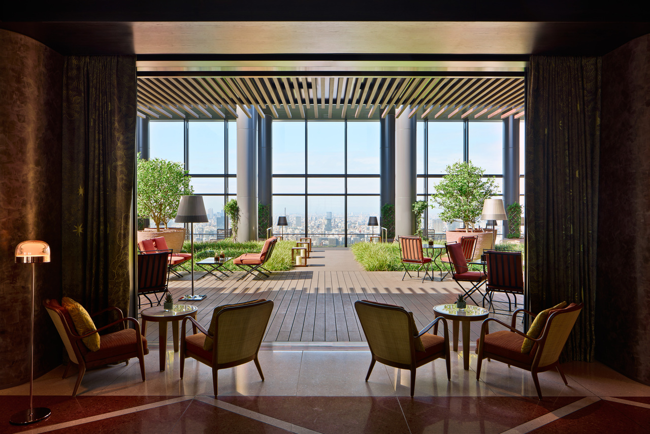 Perched on the 45th-floor rooftop of Bvlgari Hotel Tokyo, the Bvlgari Bar features a Mediterranean-style garden framed by the Tokyo skyline.
