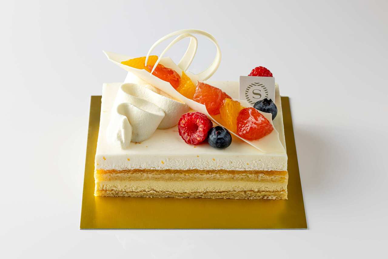 ヴァローナ社のホワイトチョコレート「オパリス」を使用した、ホワイトショコラムースにオレンジの酸味を加えた初夏らしい爽やかなケーキ