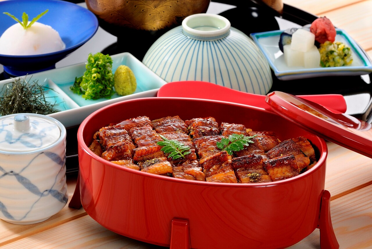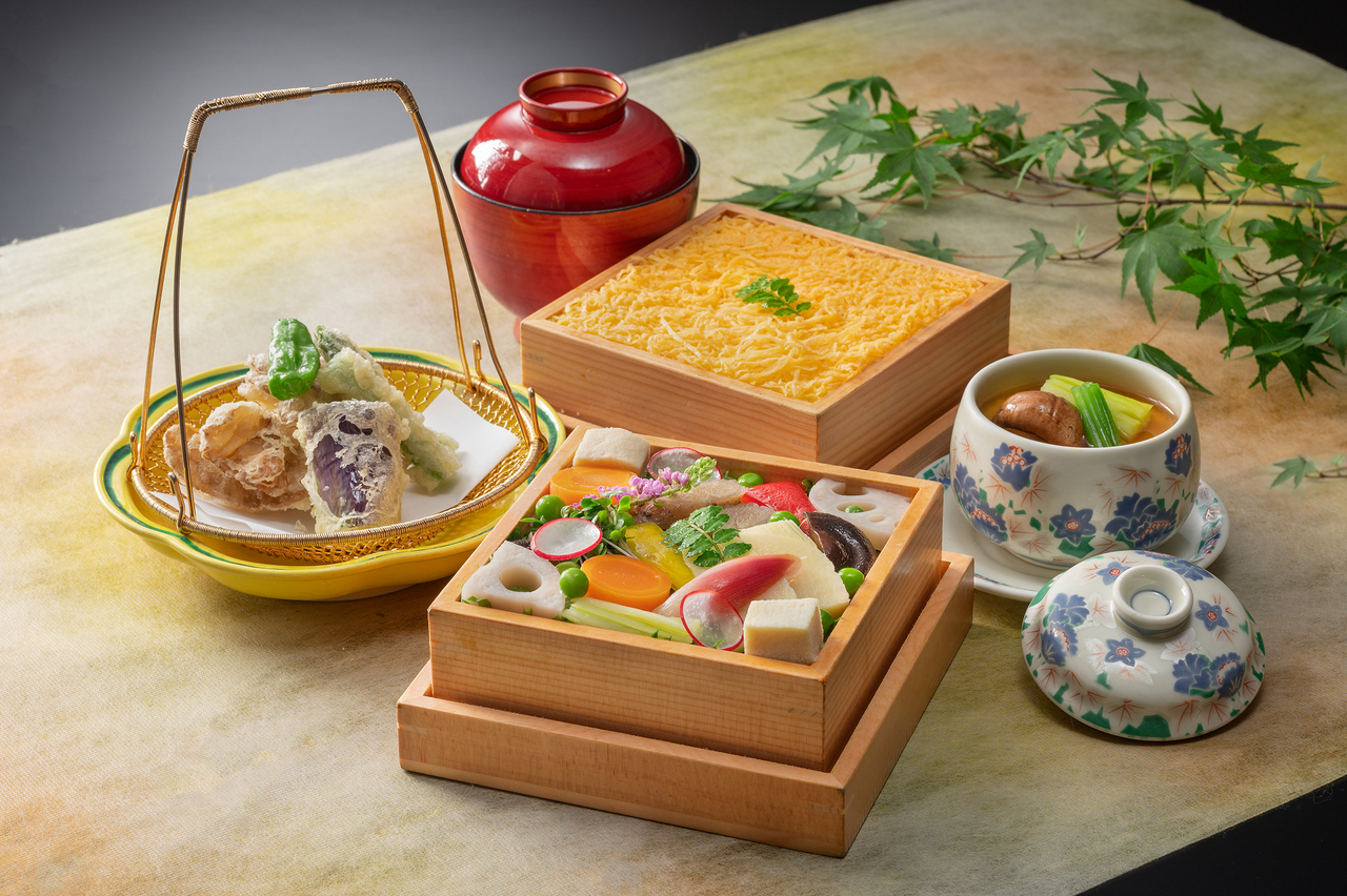 The menu features small portions of delicious food, mainly ingredients from Okayama and the Seto Inland Sea, presented in colorful small bowls and presented in gorgeous lattice wooden boxes.