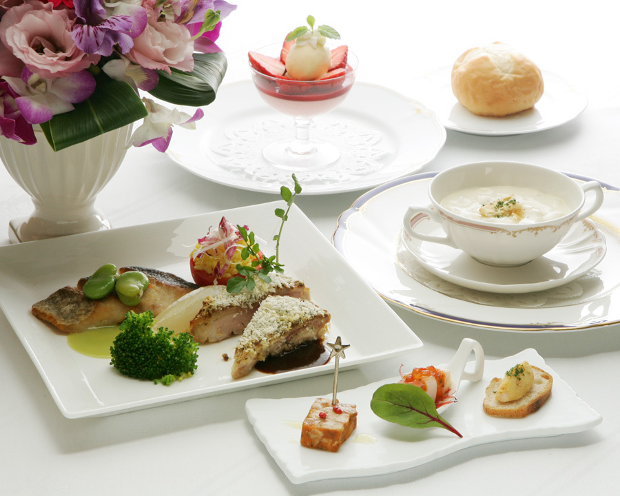 前菜1、前菜2、ダブルコンソメスープ、魚料理、和牛フィレ肉、デザート、コーヒー