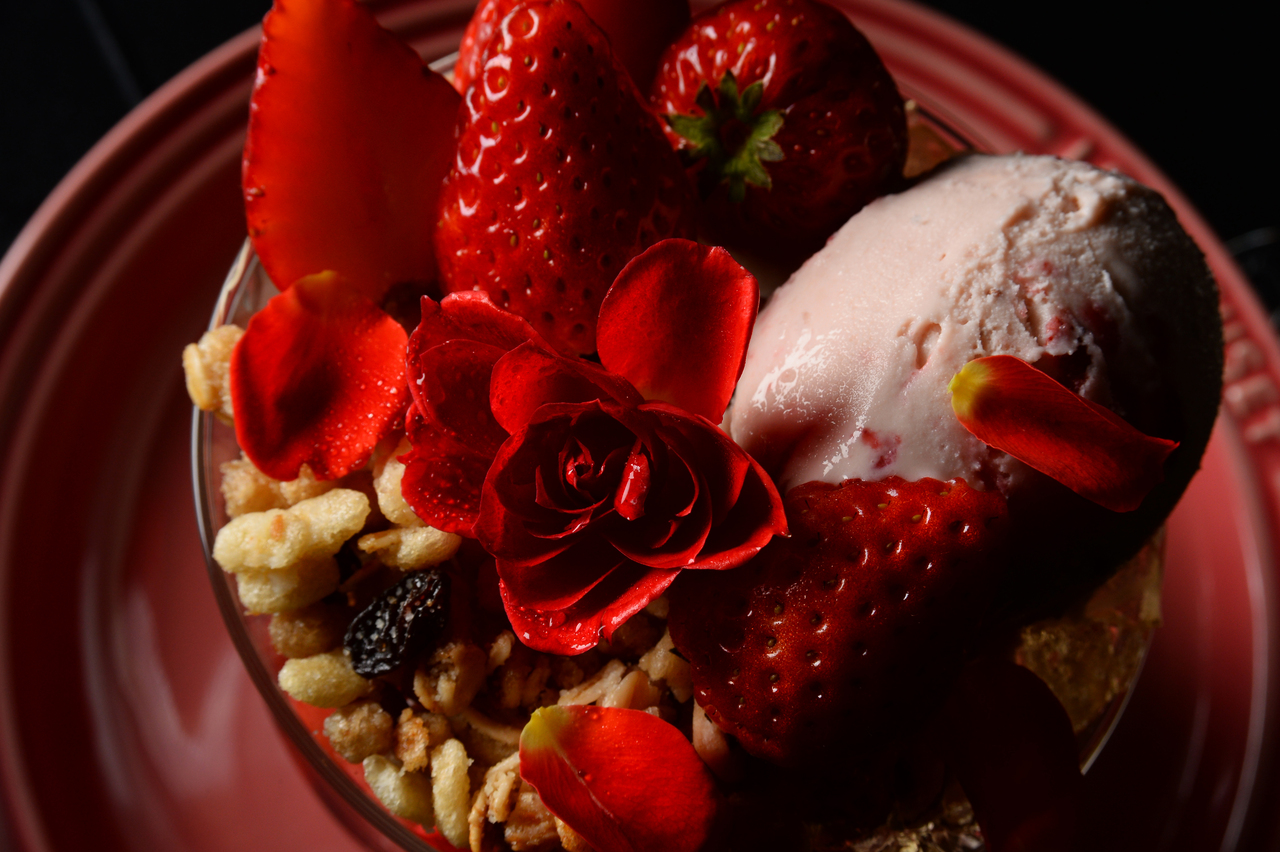 函館の夜景を望む空間で楽しむ、イチゴと薔薇のパフェ。