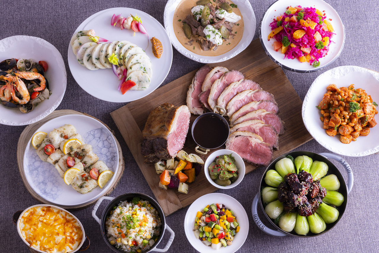 シャルキトリーやチーズ、各種前菜やサラダに加え、シェフが出来立てをご用意するパスタやカービングステーションでの日替わりお肉など、約50種類ものインターナショナルビュッフェをご賞味いただけます。