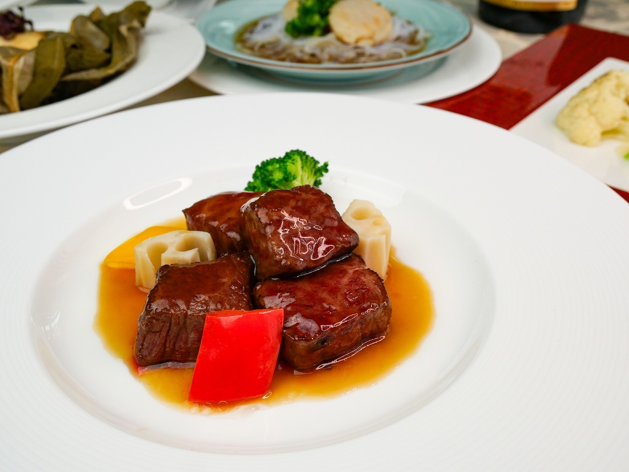 料理長 石原のシグネチャー料理「滝川産合鴨肉の香り焼き ダックロール」や、フカヒレ、十勝彩美牛のサーロインなど、贅沢食材をふんだんに使用した特別なコース。