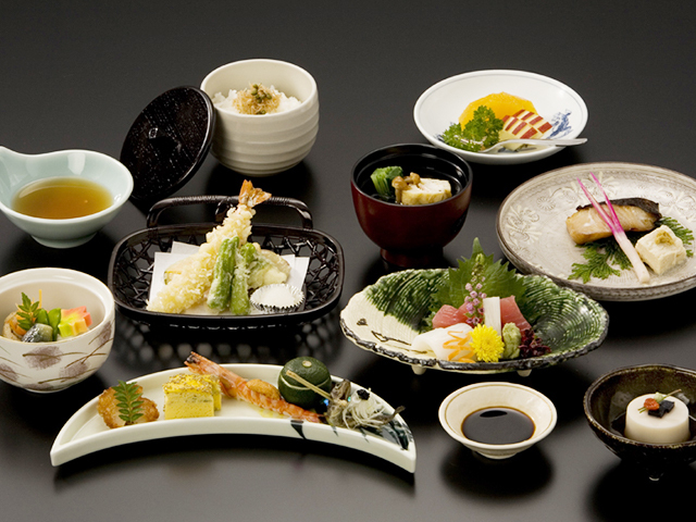 菜单包括 11 道采用时令食材烹制的京都菜肴。5 月至 11 月期间,您可以在河畔露台上享用午餐。2 月至 4 月和 12 月期间,您可以在客房内用餐,同时欣赏自然山脉的美景。