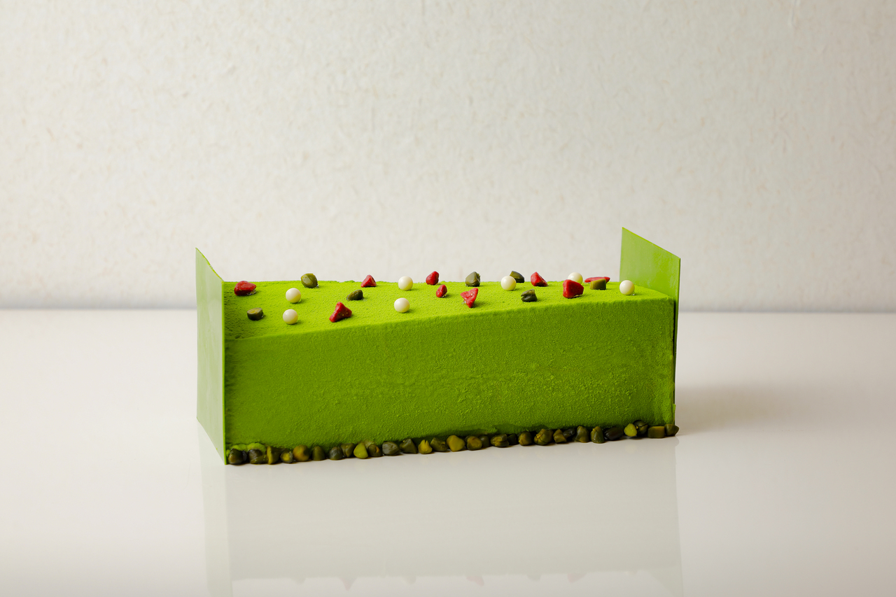 以浓郁开心果香的pândogène风味海绵蛋糕为底,配有用开心果与米粉制成的酥脆脆层。无小麦粉的可可饼干点缀柚子皮,清爽的柚子果冻为口感增添一抹轻盈。搭配大量使用意大利布隆特(Bronte)产开心果制成的浓郁慕斯,这道奢华甜点在烘烤香气与清新果味间达到完美平衡。您必定会喜爱。