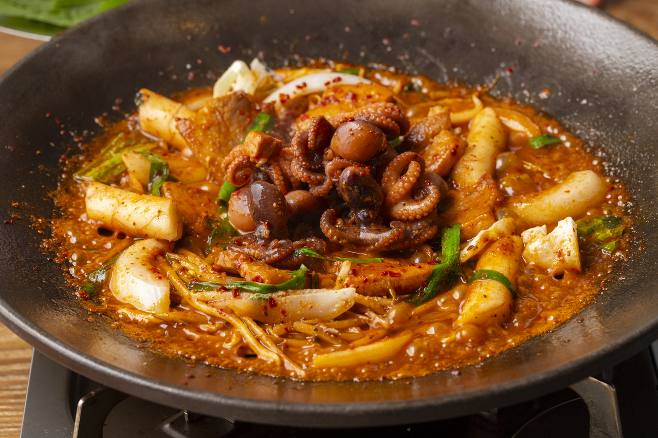 新鮮野菜のチョレギサラダや、定番のキムチとナムル盛り合わせから始まり、選べる鍋(メイン)はイイダコを使った「チュクミサムギョプサル」、またはジューシーな「厚切りサムギョプサル」、新登場した「コリアン旨辛もつ鍋」、「海鮮キムチチゲ」の4種類をご用意。さらに人気のヤンニョム&ハニーマスタードチキン、蒸したて熱々のせいろ蒸しマンドゥ、〆のお食事、最後はアイスまで大満足の全8品。