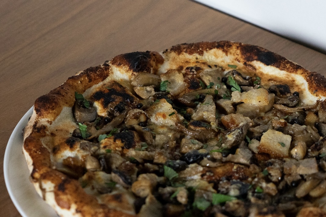 Mixed Black Soybeans Miso, Garlic mushrooms, House-made bacon, Grana Padano, Fresh Black Pepper, Italian parsley, Olives oil