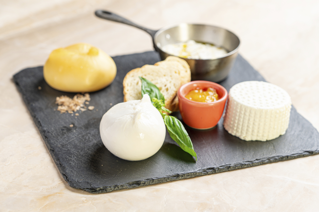 自家製リコッタチーズ、ホエーの泡、ブラウンチーズとリコッタサラータにキャビア