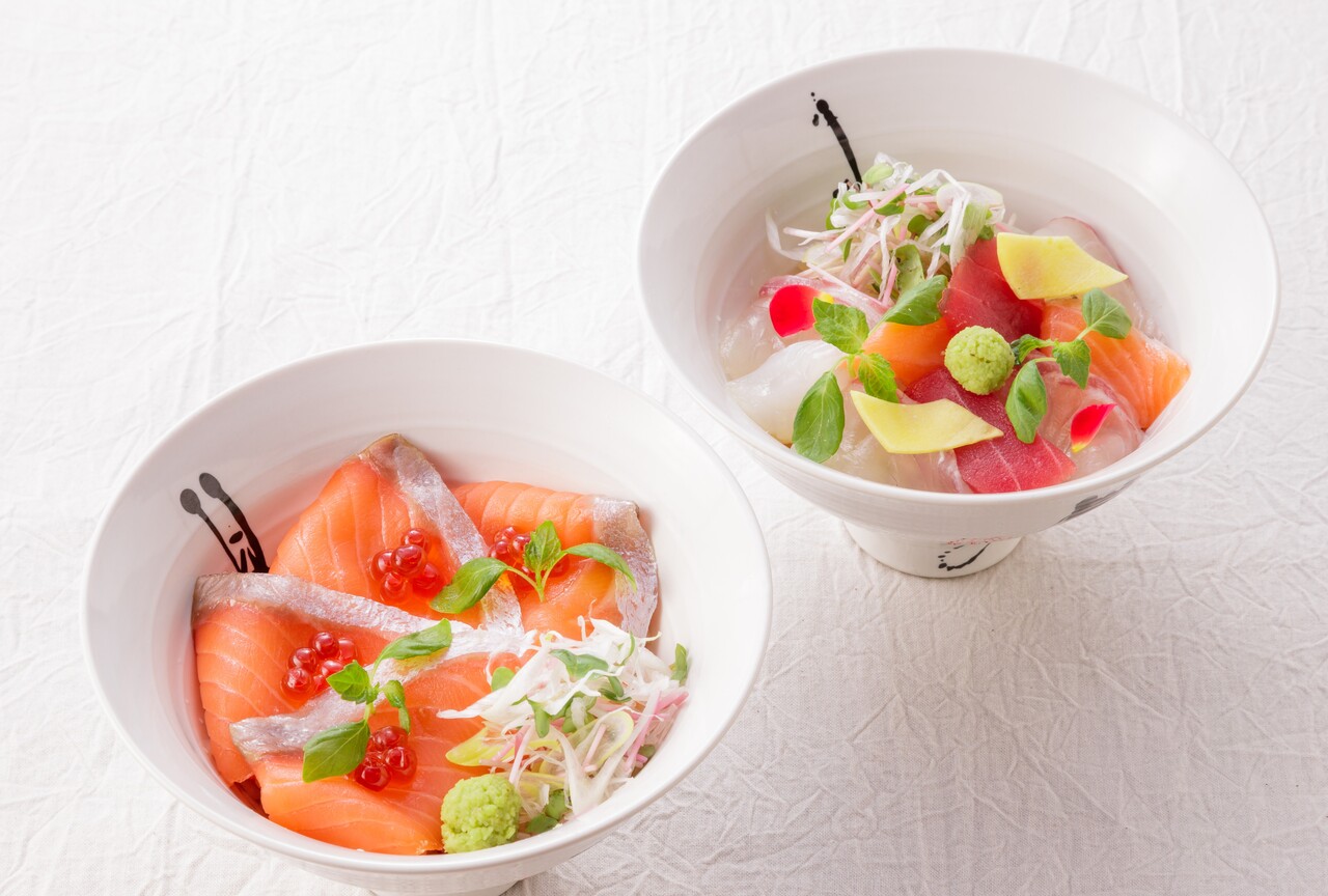 两种海鲜盖饭套餐可供选择:特选鲑鱼盖饭和江户前海鲜盖饭