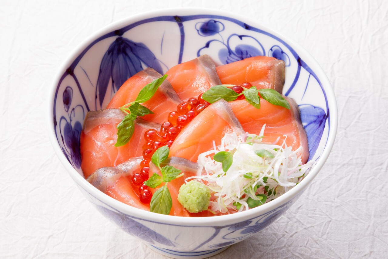 这是一份海鲜亲子丼,上面铺满了美味的鲑鱼和鲑鱼子。