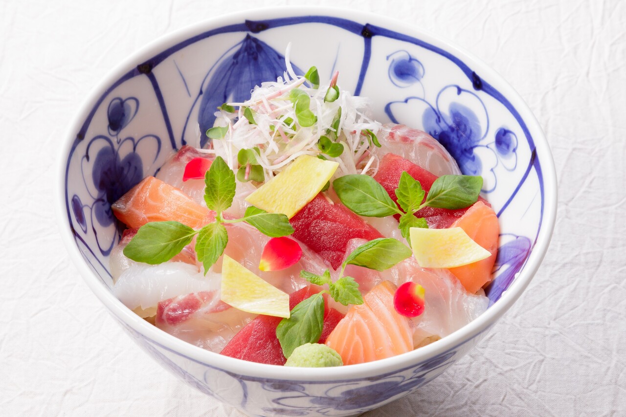 有两种海鲜盖饭套餐可供选择:山雪金枪鱼瘦肉腌制盖饭和江户前海鲜盖饭