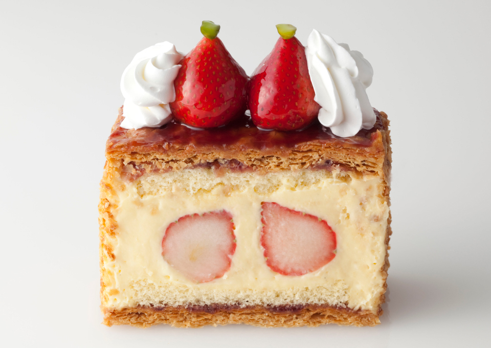 「博多あまおう」との相性抜群なホテルニューオータニ特製カスタードがたっぷりと。さらに、パイ生地とクリームの間のスポンジ生地には長崎県産「太陽卵」を使用。「博多あまおう」の弾けるようなみずみずしい甘みとサクサクのパイ生地、さらにふっくらとしたスポンジ生地のコンビネーションをご堪能できる逸品です。