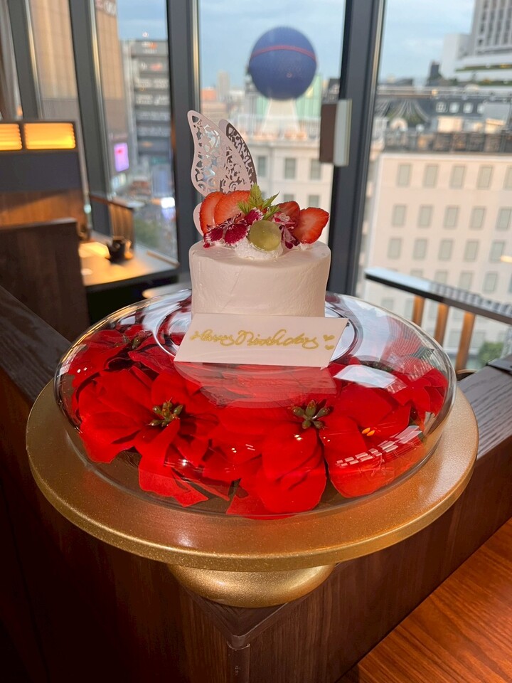 一边欣赏难波的全景,一边享用庆祝午餐!用玫瑰装饰的原创蛋糕