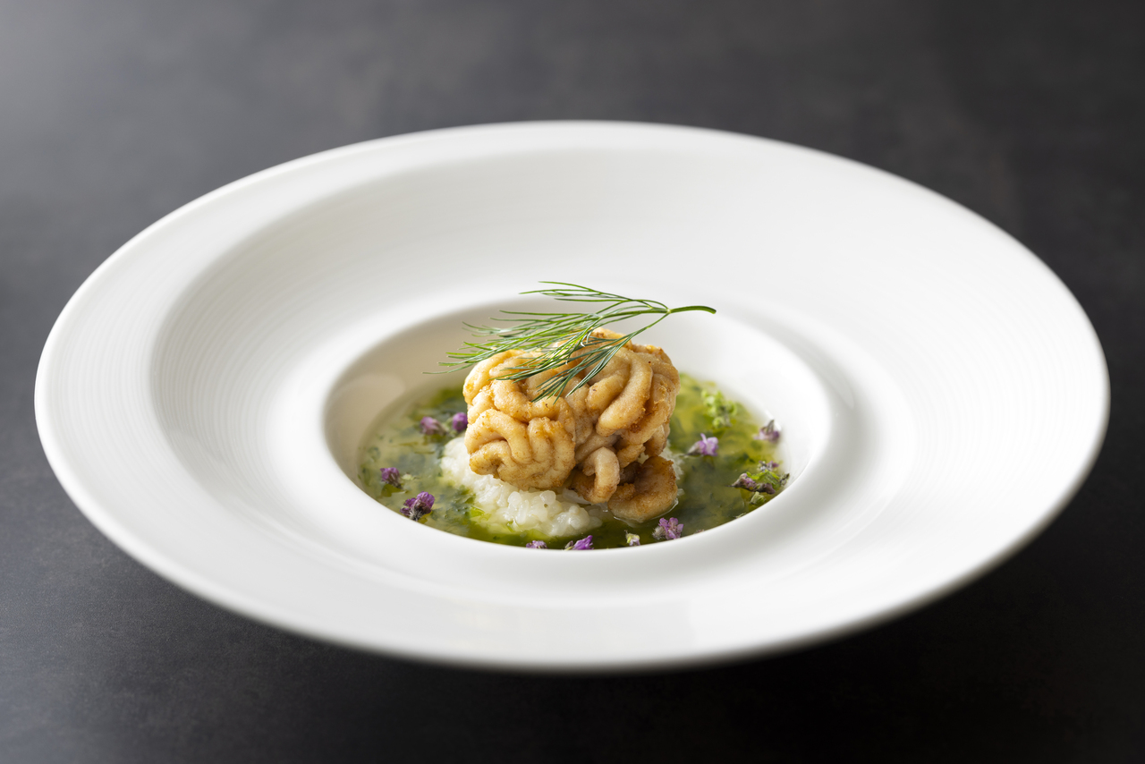 鱈の白子のポワレ チーズのリゾットと青海苔のソース和風仕立て