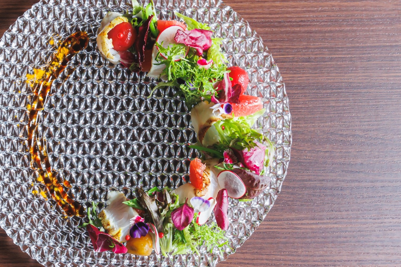 ●Red paprika mousse, octopus, Kamakura vegetables and kasuri meti