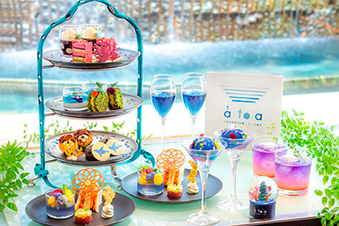 劇場型アクアリウム「AQUARIUM×ART àtoa(以下:アトア)」とのコラボレーションアフタヌーンティーセット。アトアの幻想的な空間に着想を得て、初夏らしい光や水のきらめきを映した、爽やかなラインナップでお届けいたします。