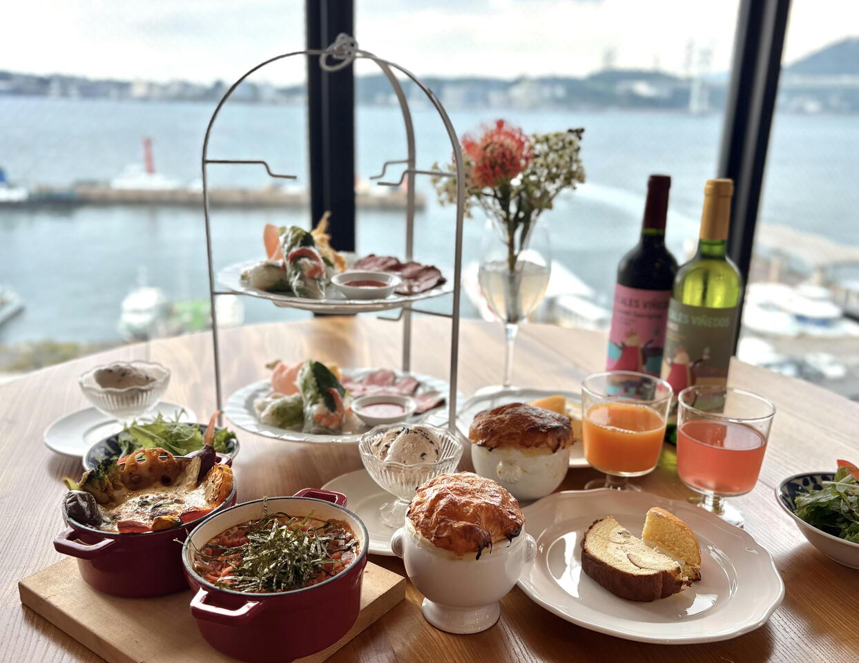 这份轻食套餐包含开胃菜、沙拉、烤咖喱和甜点,您可以在欣赏门司湖壮丽海景的同时享用美食。