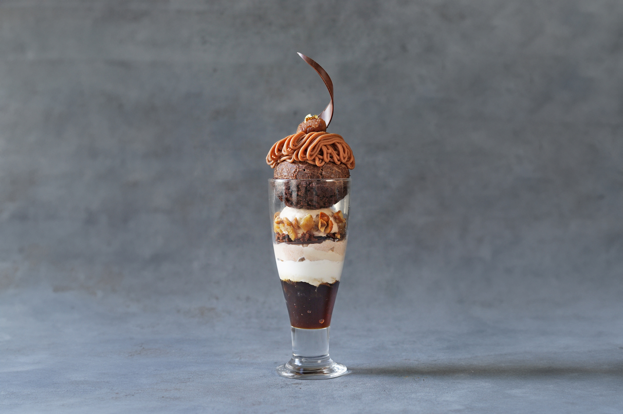 洋栗の名産地である香り高いイタリア産マロンで作ったクリームやアイス、パンナコッタにキャラメルを合わせ、コーヒージュレやヘーゼルナッツをアクセントに。