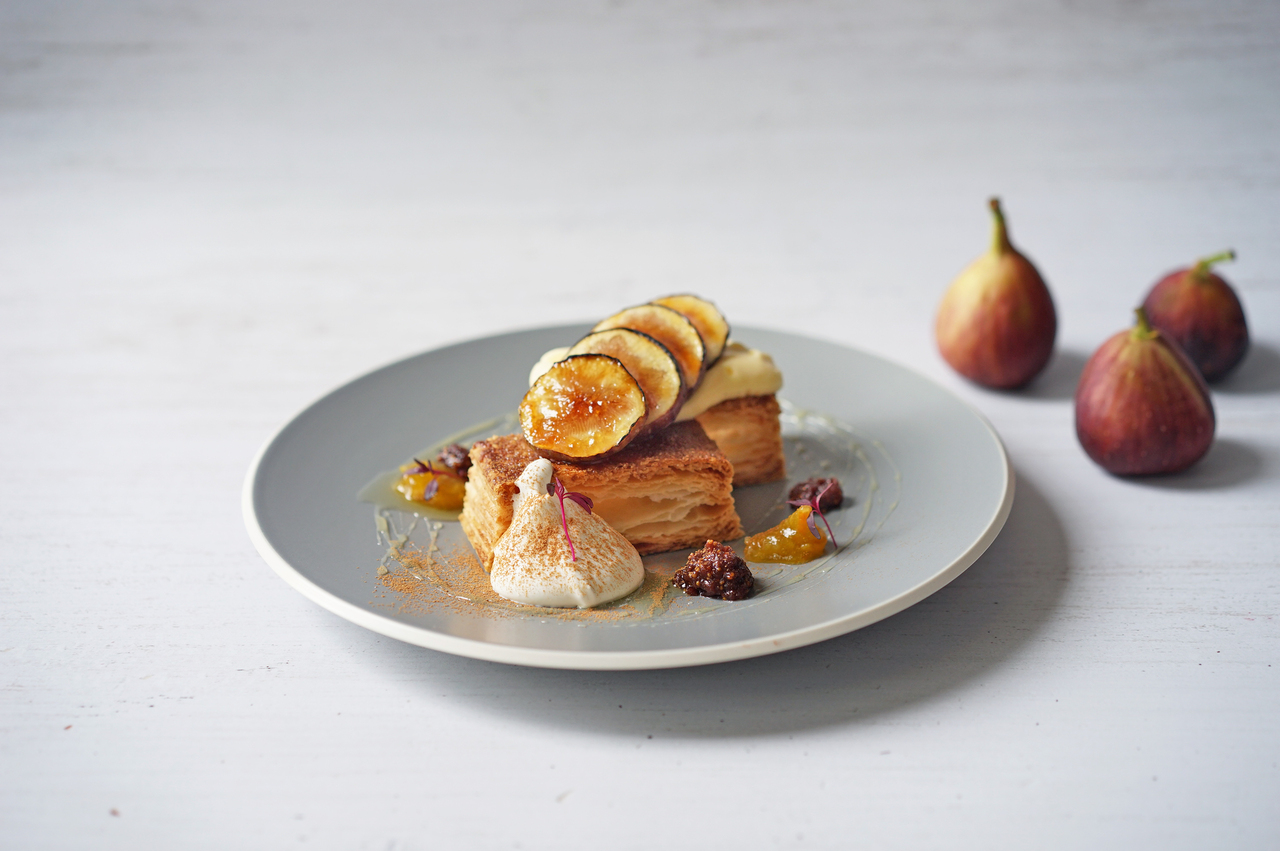 自家製パイ生地をプレスせずに焼き上げたミルフィーユはとても軽い食感に。シナモン香るパイ生地にカスタードクリーム、無花果のコンフィチュール、埼玉県産蜂蜜、キャラメリゼしたいちじくを添えたイートイン限定のデザート。