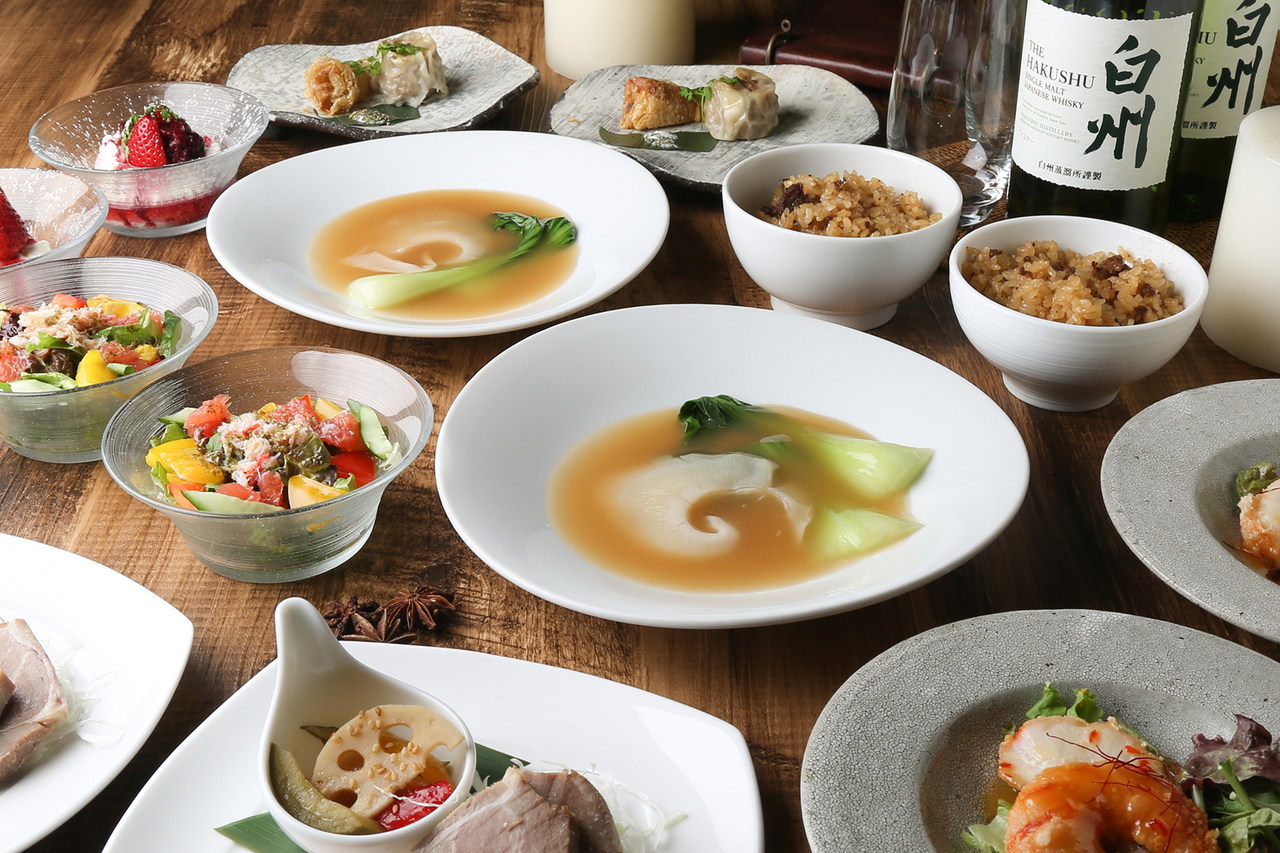 [Cold dishes] Assortment of three appetizers, fresh fish carpaccio, homemade roast pork, smoked Camembert cheese [Hot dishes] Two kinds of dim sum [Salad] Mimosa salad of colorful vegetables and boiled chicken [Main dish] Deep-fried pork loin with garlic and fragrant spicy sauce [Dish] Today's rice [Dessert] Original almond tofu *Please note that the course contents may change depending on the availability of ingredients. ■Drinks menu・Beer: The Premium Malts・Whiskey: Ballantine/Maker's Mark/Jim Beam/Kaku・Wine: White wine/Red wine/Sparkling wine・Shochu: Potato/Barley/Oolong High・Cocktails: Gin and Tonic/Moscow Mule/Rum Buck/Rum Coke/Tequila Coke/Cassis & Orange/Fuzzy Navel/Lychee & Orange/Vodka Tonic: Malibu Coke/Gin Buck/Kitty/Operator/Cassis Sparkling/Orange Sparkling/Peach Sparkling/Shandy Gaff・Soft Drinks: Cola/Ginger Ale/Orange/Oolong Tea/Jasmine Tea
