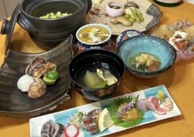 【料理】前菜、汤品、生鱼片、烤鱼、时令小菜、土锅饭、抹茶甜点