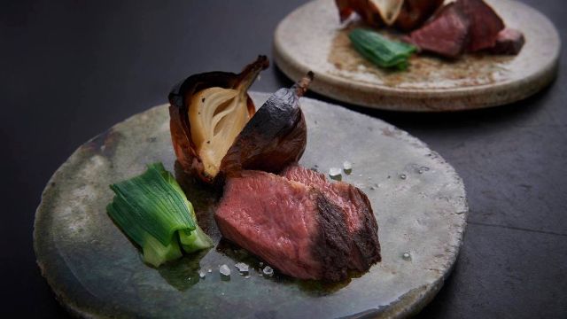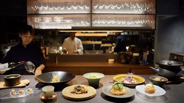 店内に足を踏み入れると、黒を基調とした落ち着いた空間が広がります。当店のこだわりの一つは、料理を引き立てる器の数々。粋な器に盛り付けられる料理は、淡路島を始め世界各地から厳選した食材を使用しています。その日に使う食材によってメニューが変わるため、何度訪れても新鮮な気持ちで料理を楽しめます。豊富に取り揃えた世界各国のワインと料理のマリアージュをご堪能ください。