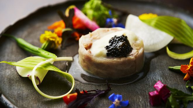 ダークブラウンと深みのあるレッドで統一された店内は、ワインを楽しむのに相応しい洗練された雰囲気です。壁際には大きなワインセラーがあり、世界各国から取り寄せたたくさんのワインを目で見て楽しむこともできます。ワインとのハーモニーをより一層楽しめるよう、国内外の旬の食材を、素材の味を大切にしながら調理しています。伝統的なフランス料理を受け継ぎながらも季節感あふれる個性豊かな当店のモダンフレンチをぜひお楽しみください。