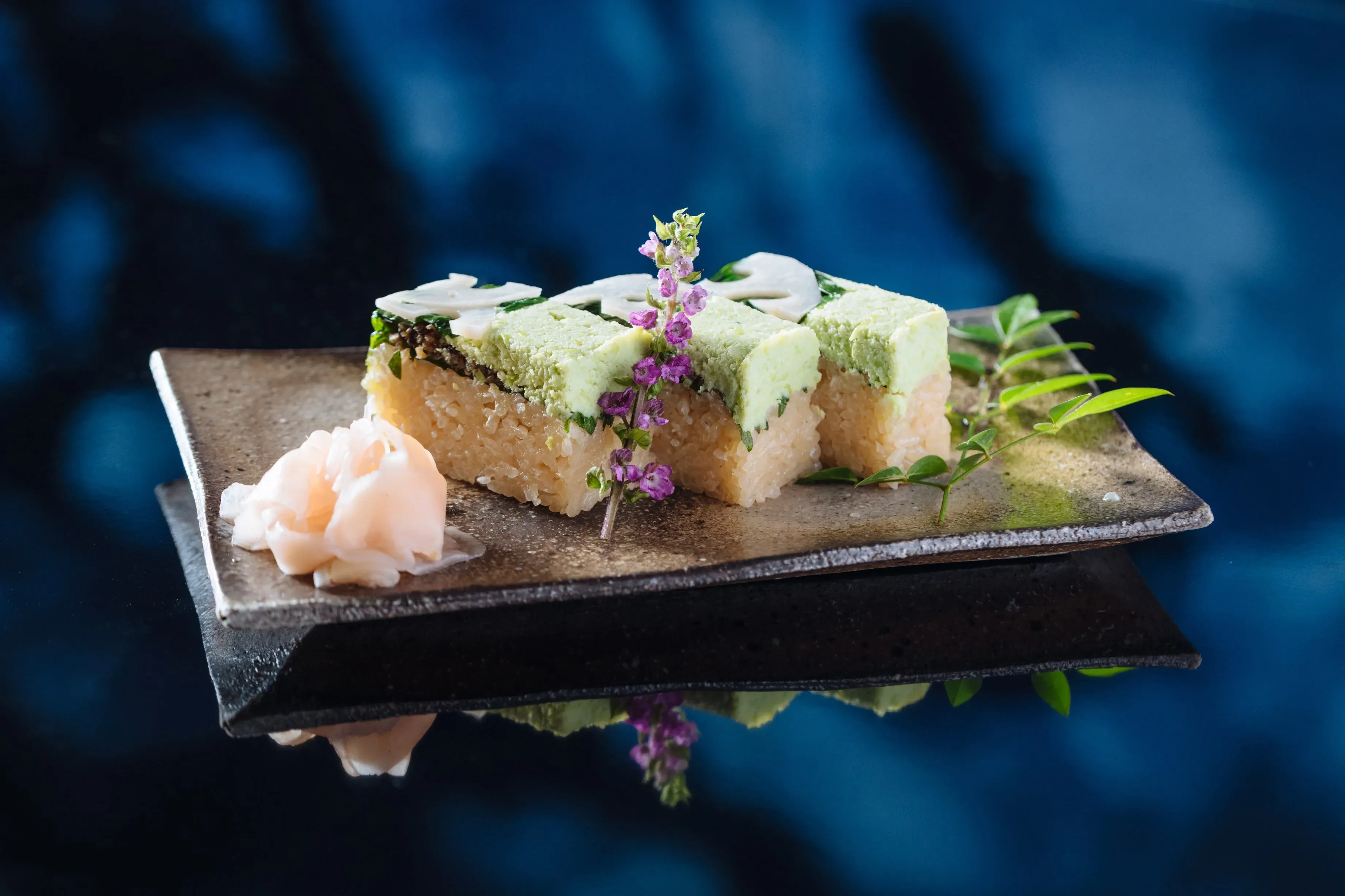 Opened in 2020 in Gosho Minami, Kyoto, Vegan Ramen UZU features teamLab's artwork, 'Reversed Indiscretion,' displayed on the walls. Black polished tables surround the artwork, creating a unique dining experience. Guests can enjoy vegan food in the midst of this artistic ambiance, reflected not only on the walls but also on their tables.