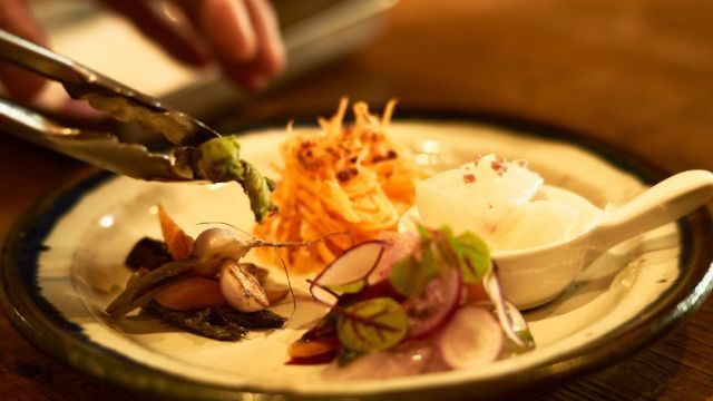 Eme位於東京武藏小山,是一家感覺就像隱密的餐廳,位於歷史悠久的拱廊購物街的一家綠色商店的後面。菜餚以傳統的法國和巴斯克美食為主,風格獨特,家具和古董巴卡拉酒杯都是廚師親自從世界各地收集的,長牆酒窖前設有一個大櫃檯。無論是與親人一起還是獨自一人,您都可以度過愉快的時光。
