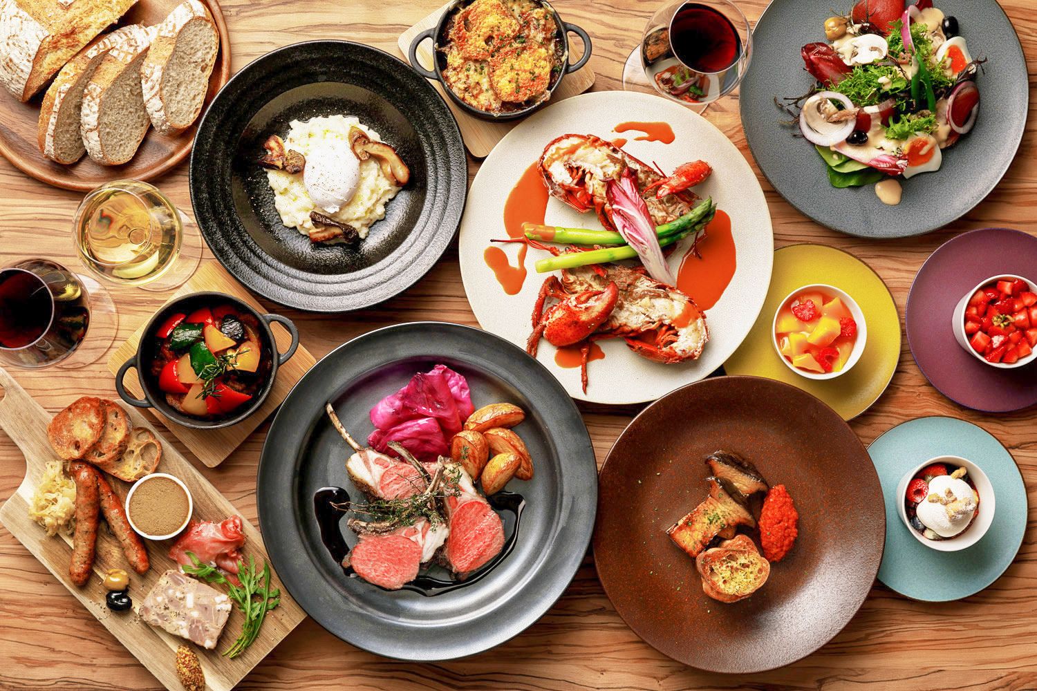 THE MARKET F is a "Bistronomy"-style all day dining restaurant located within Grand Hyatt Fukuoka. Guests are welcomed by an open kitchen and charcoal grill in the center of the floor.