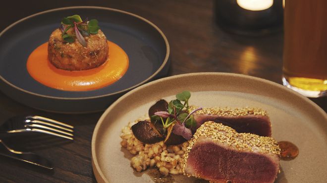 店内は穏やかな鴨川を望みながら、リラックした気分で料理を楽しめる空間が広がっています。アメリカンスタイルの料理を味わいたい、そんな方に最適なメニューを揃えています。魚メインで食べたい方は、真鯛のカルパッチョやサーモンキヌアケーキ、マグロのレアステーキをどうぞ。肉料理を食べたい方には、生産地を激選した国産牛サーロインステーキや和牛ミートボールをご用意しています。そして、食事と一緒に幅広い産地からセレクトしたワインもどうぞ。