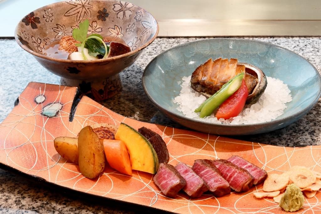 Enjoy spectacular teppanyaki (grilling on an iron plate) where Japan meets the West in a luxurious hotel atmosphere. Delight in a lineup of dishes such as Japanese beef, abalone, lobster, and other fresh seafood and Kyoto vegetables, all cooked over a beautiful grill and seasoned to taste with gourmet condiments. A sommelier will pair the perfect wine with your dishes.