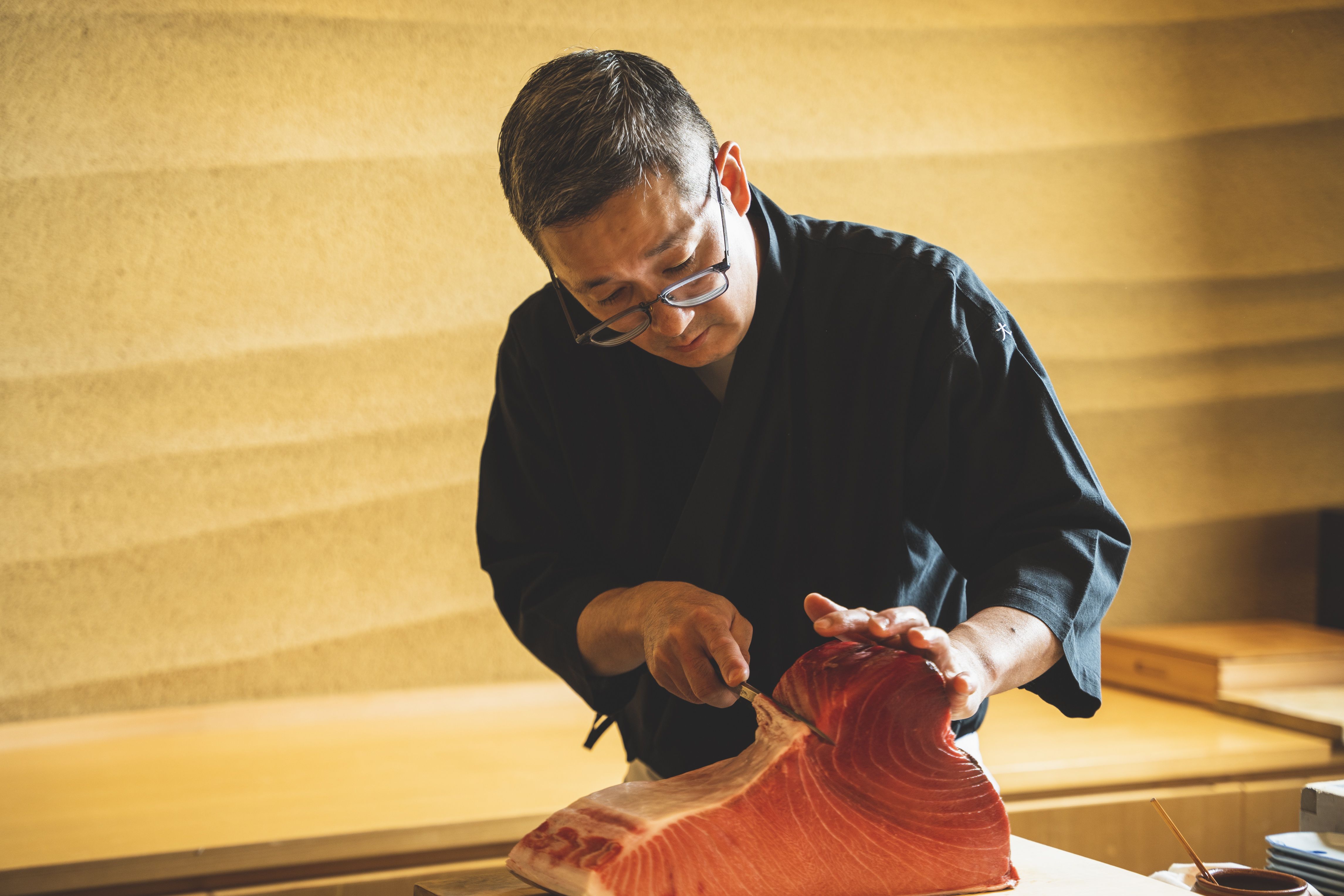 店内に一歩足を踏み入れると、檜のカウンターが迎える隠れ家的な雰囲気が広がります。大東料理長が厳選した旬の食材を使い、一手間かけた握り鮨は醤油をつけずにそのまま楽しめる絶品です。全国各地から取り寄せた器や酒器も魅力の一つ。本格的な鮨と出逢えるカウンター席で、繊細な匠の技をぜひご堪能ください。