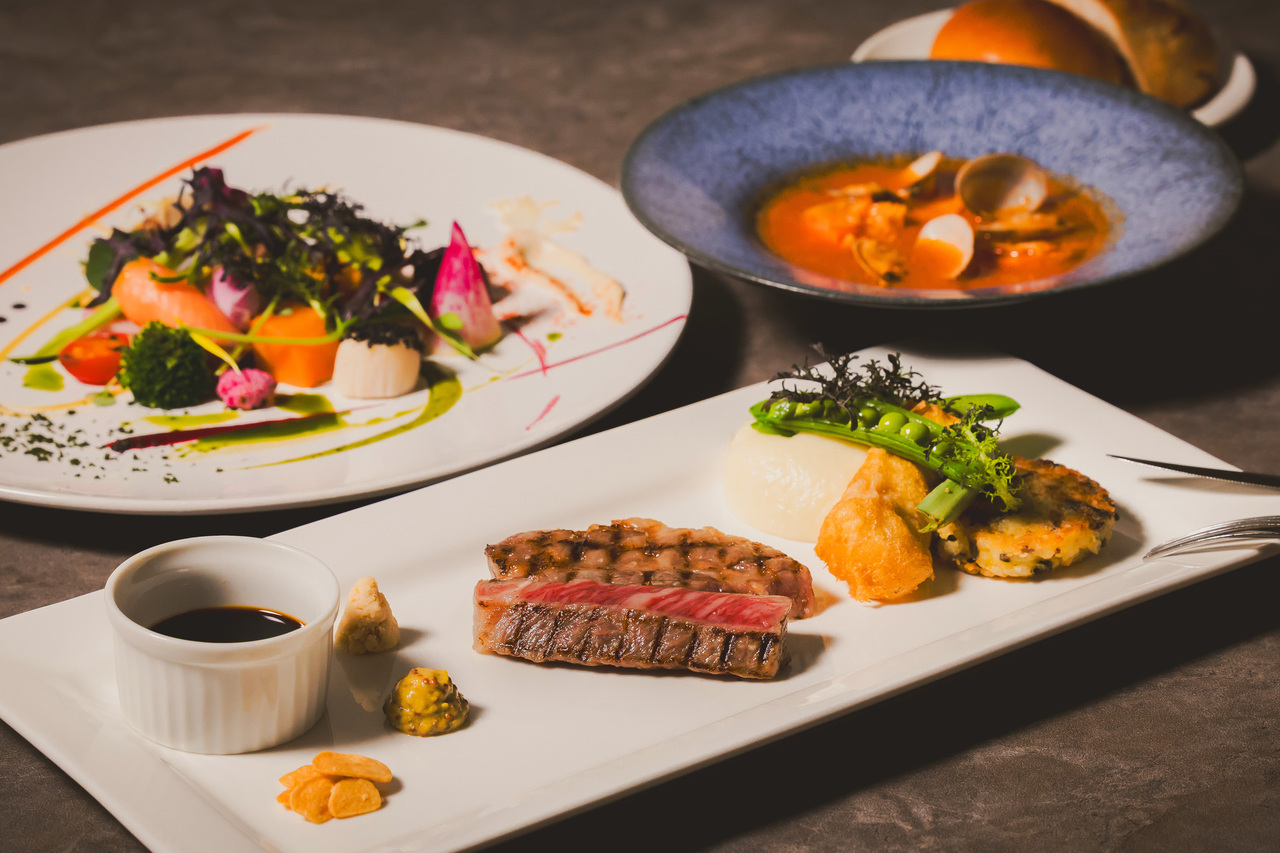 丁寧に焼き上げ旨みを閉じ込めた神戸ビーフを季節の食材とともに味わうランチコースです。にんにく醤油とコンディメンツが織りなす、奥深い味わいをご堪能ください。MSC/ASC認証のサステナブル・シーフードを使用した色鮮やかな前菜プレートとトマトベースのクラムチャウダー、パン、デザート付。