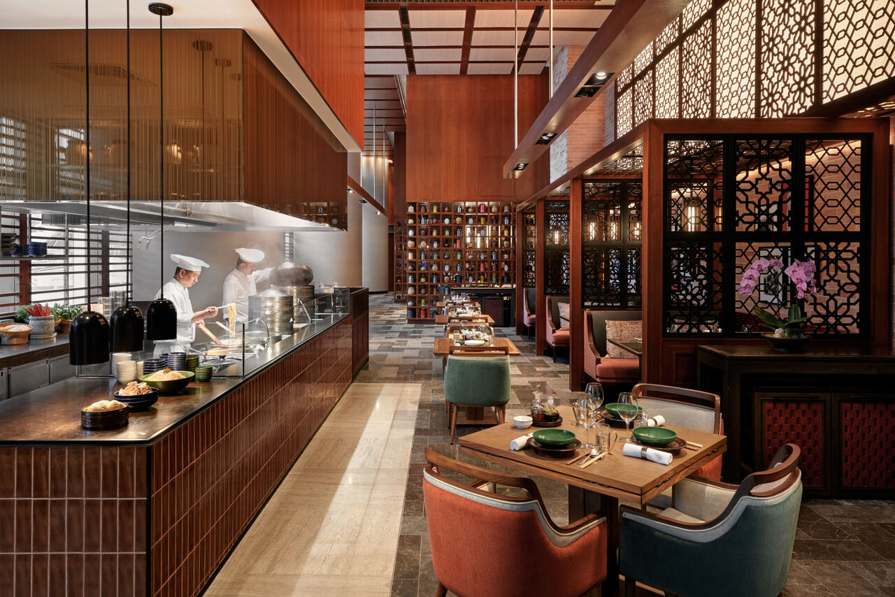 從門口精心擺設的中式茶壺,到室內舒適的座位,滿堂彩結合了完美的中西設計佈局,使客人享受到寫意的感覺。由大師級名廚主理的四個開放式廚房食檔提供精心炮製的中國美食:老式果木烤鴨、手拉麵、明爐小炒、點心,以及有多種甜品任君選擇。