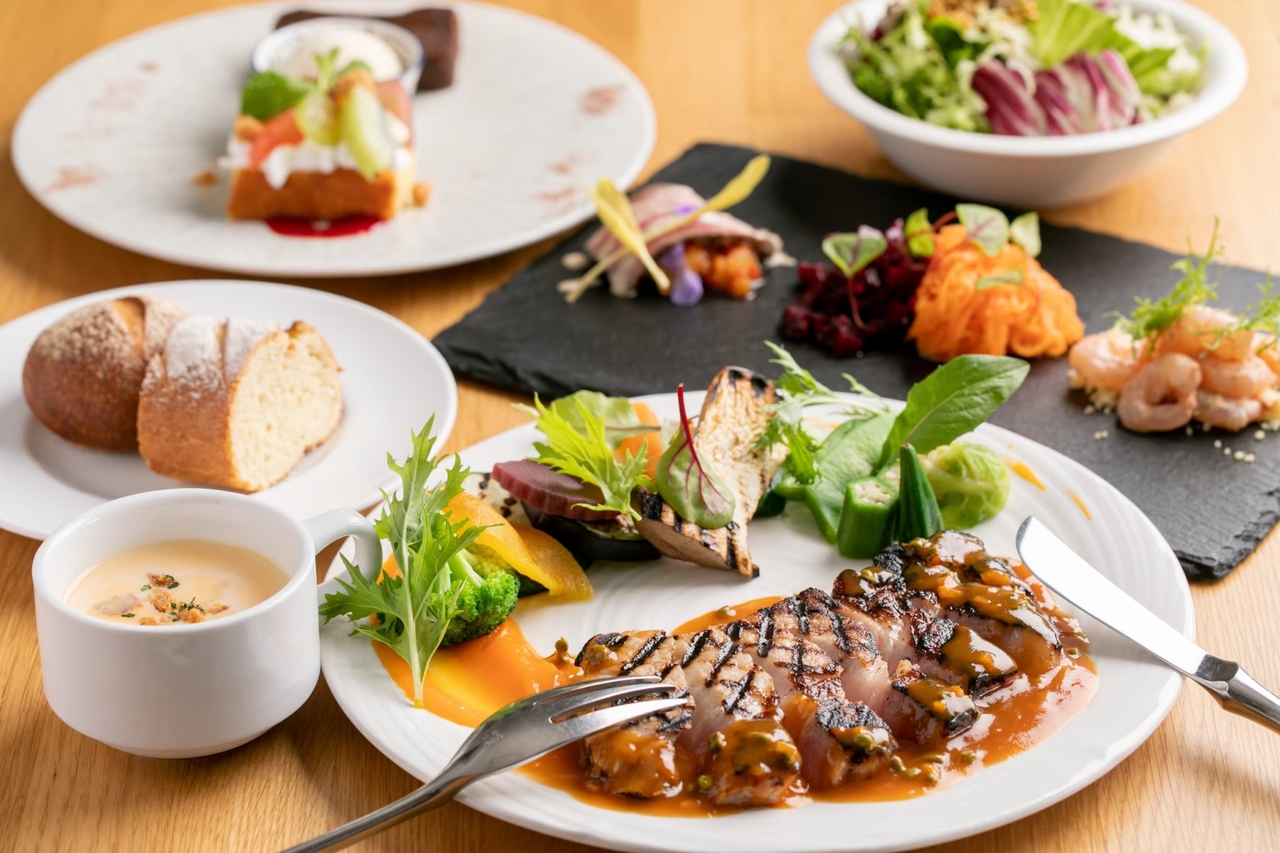 ミニスープ・おまかせ前菜・サラダ・パン・魚料理・肉料理・デザート