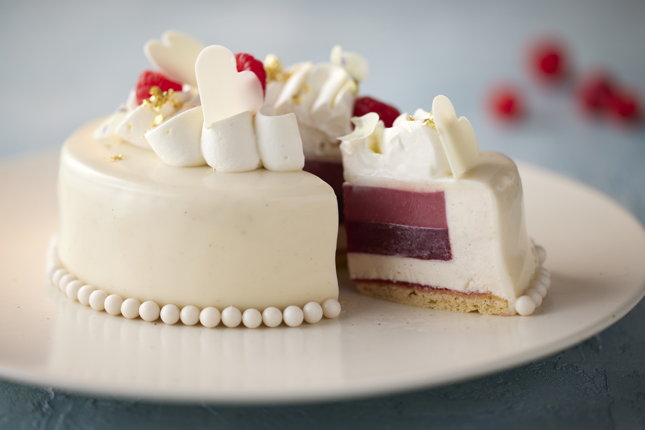 蛋糕表面裹著一層白巧克力,呈現柔和的白色。白巧克力的醇厚與覆盆子的酸甜完美融合,帶來令人難忘的美味,切面也十分美觀。
