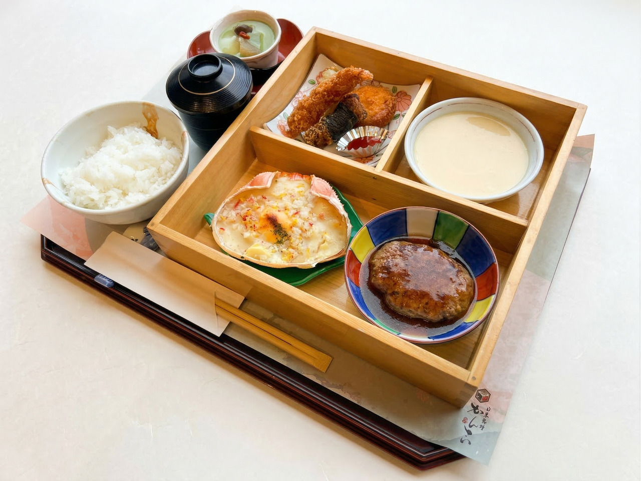 ハンバーグ 揚げ物盛り カニグラタン 茶わん蒸し ごはん 赤だし デザート