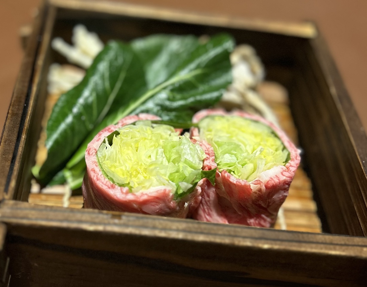 一道盛宴菜式,包括入口即化的優質近江牛肉涮涮鍋和香氣四溢的稻草烤近江牛肉瘦肉。